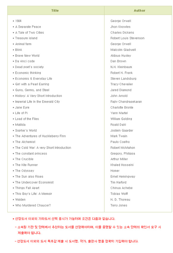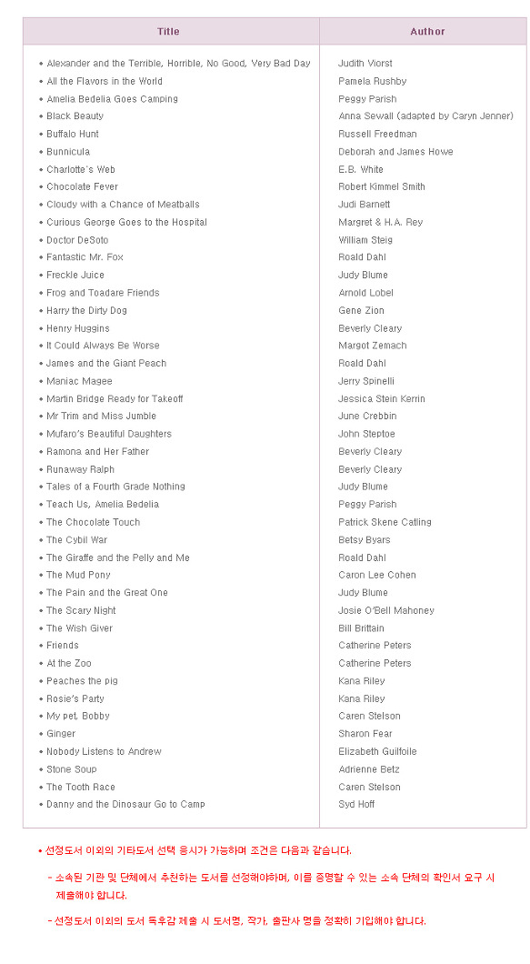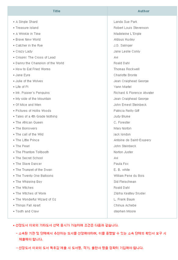 IET-RC ¿µ¾îµ¶¼´ëȸ¿¡¼ ¼±Á¤µÈ Ãʵî, Áßµî, °íµî µµ¼¸ñ·ÏÀ» ¿Ã·Áº¾´Ï´Ù. ¿©±â¿¡ ¼±Á¤µÈ µµ¼ Áß¿¡¼ ÀÐ°í ±ÛÀ» ¾²´Â °ÍÀ̾ú´ä´Ï´Ù. »ç½Ç ÃÊµî ¼±Á¤µµ¼º¸´Ù´Â ÁßµîÀ̳ª °íµî¿¡¼ ¾²°í ½ÍÀº µµ¼°¡ ÀÖ¾úÀ¸³ª ÃʵîÀº ÃʵÁ¤µµ¼ Áß¿¡¼¸¸ ¼±ÅÃÇØ¼ ½á¾ß ÇÑ´ÙÇØ¼ Maniac Magee¸¦ ¼±ÅÃÇØ¼ ¿µ¾îµ¶ÈݨÀ» ³Â´ä´Ï´Ù.